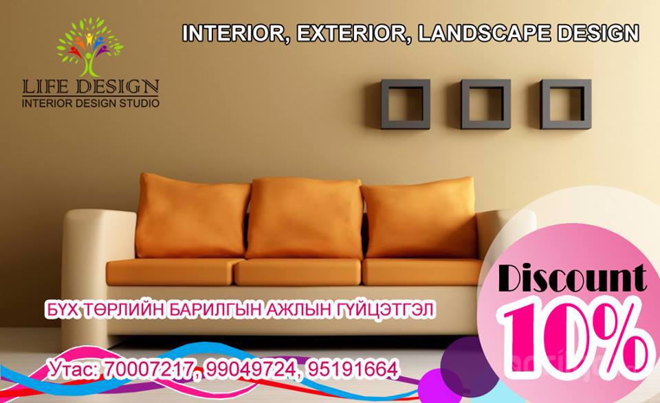 Сайн байцгаана уу? Эрхэм үйлчлүүлэгчидээ! Манай "LIFE DESIGN" интерьер дизайн студийн Discount карт гадуур барилгын материалын дэлгүүрүүдээр тараагдсан. Мөн "Барилга.МН" сэтгүүлтэй цуг худалдаанд гарсан байгаа. Тус карттай эсвэл и-мэйлээр илгээсэн энэхүү зургийг хэвлэж авчирсан та бүхэнд манай хамт олон 10%-ийн хөнгөлөлттэй үйлчлэх болно. Таны ажилд амжилт хүсье!